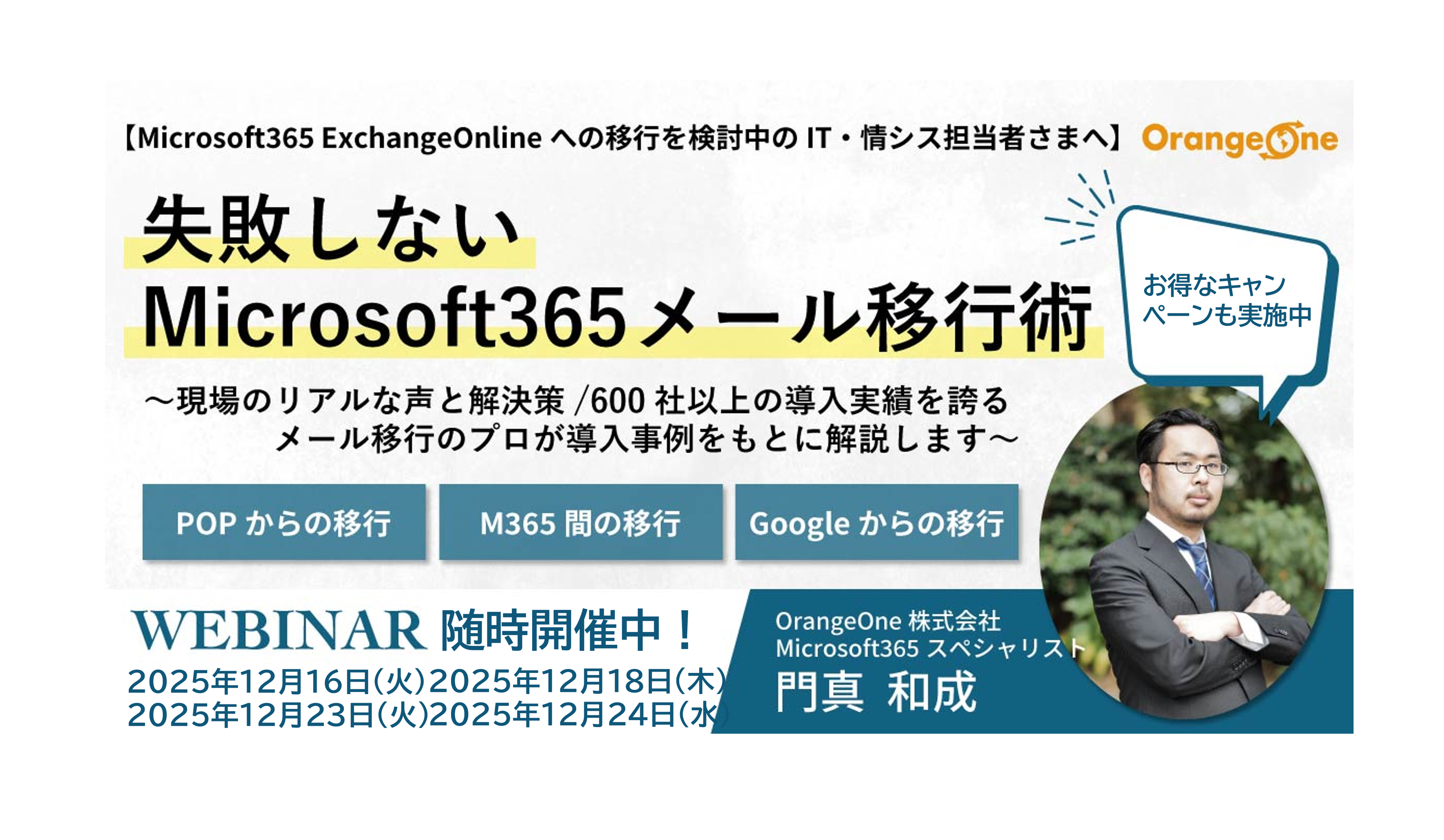 セミナー内容 - ExchangeOnlineとは(必要なMicrosoft365ライセンスや導入メリット等) - ExchangeOnlineへの移行手順/方法 - よくある課題 - 事例解説(Googleからの移行やオンプレミスサーバーから移行の具体例も) - サポート内容 - キャンペーンのご案内(ウェビナー参加限定のお得な値引きキャンペーンです) - 質疑応答 ※アジェンダは変更となる可能性があります。 |